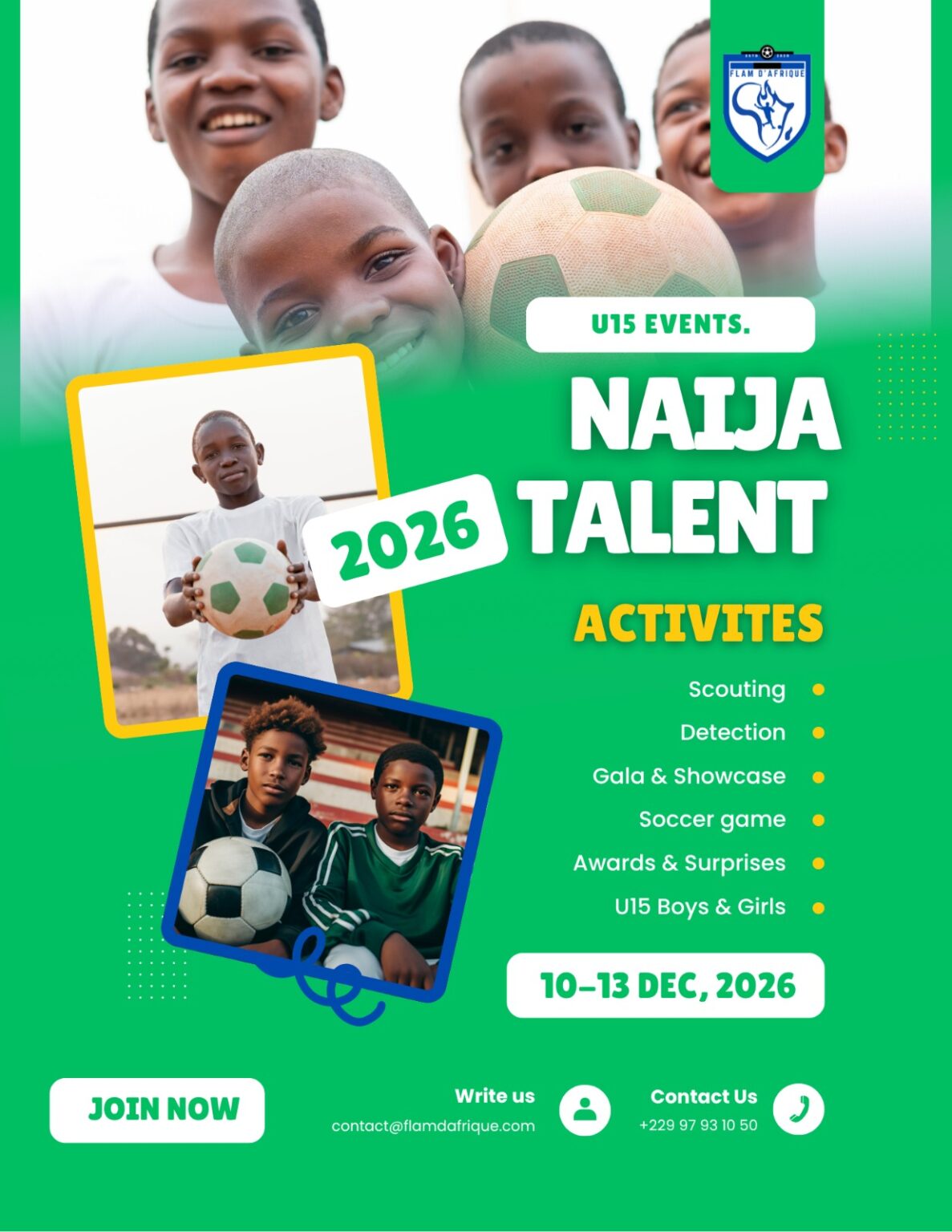 Le Naija Talent Events, organisé par Flam d’Afrique, est un grand rendez-vous de détection, de compétition et de mise en lumière des jeunes footballeurs venus de toute l’Afrique de l’Ouest.